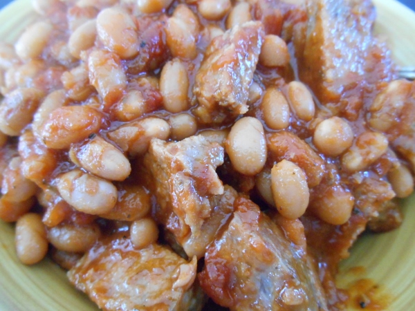 At that point, I drained them, and in the pot, I put a bit of good lard, two finely diced onions, six cloves of garlic and cooked till clear, then I added in one quart of tomato sauce, and one quart of diced spiced tomato’s, 1/4 cups of fancy molassies, one tbsp. of salt, one full tbsp. of montreal steak spice. This was brought to a simmer to allow the flavours to meld.