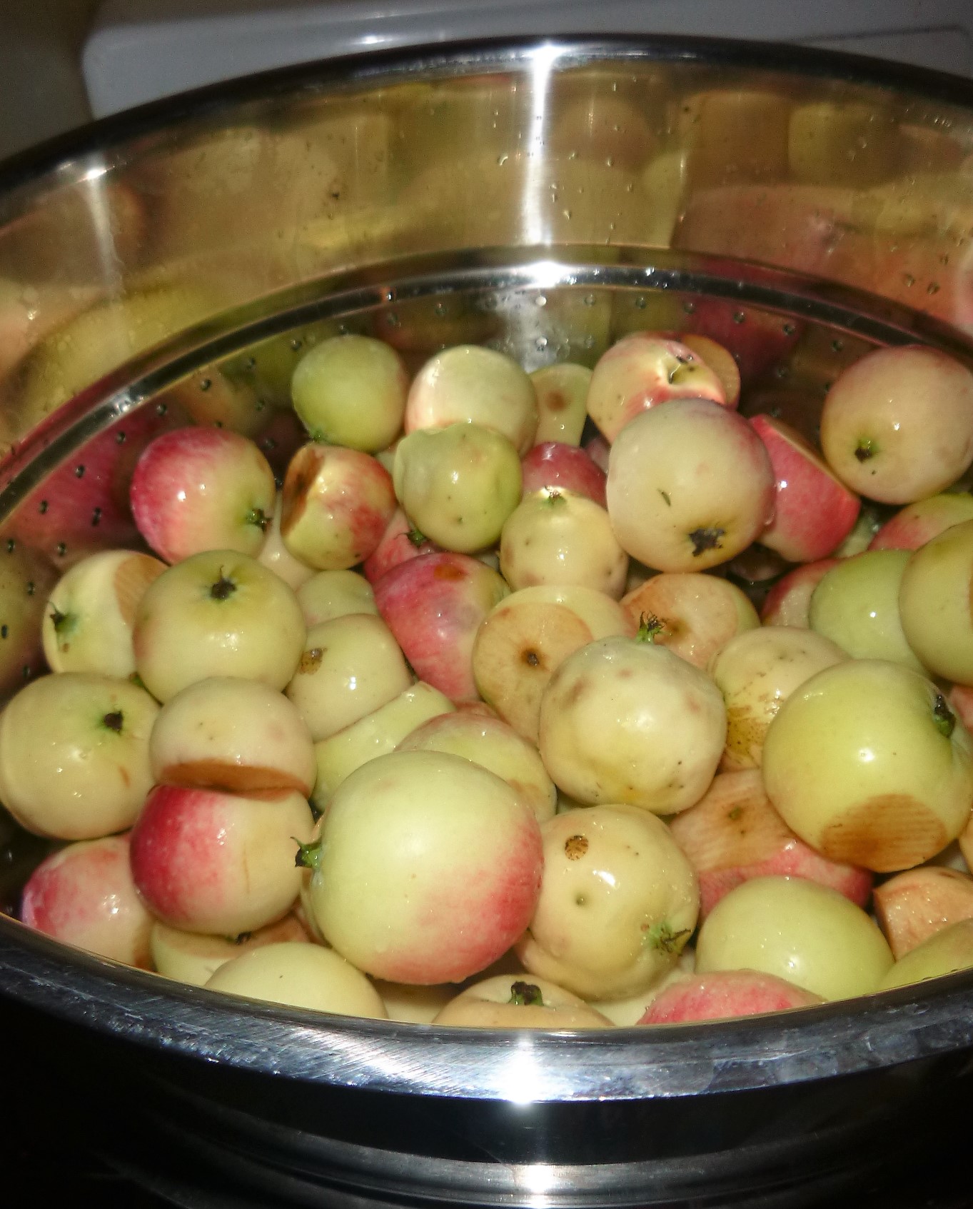 So yesterday’s harvest was crab apples for crab apple jelly.. These apples were good size for this year but they are certainly farm apples and not perfect ones like the store 🙂
