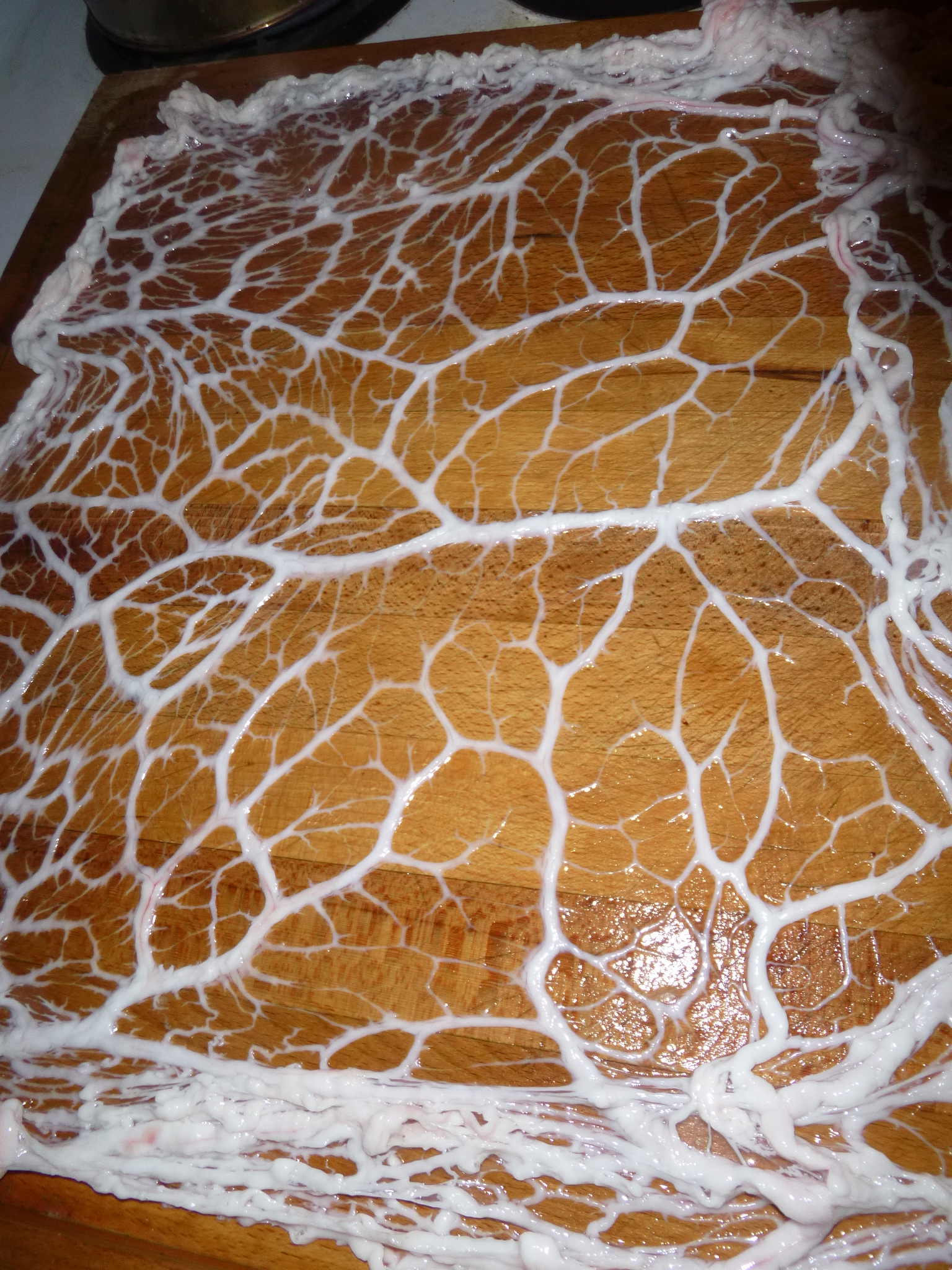Caul fat is a translucent lace of fat, and it melts when cooked, so it provides moisture and flavor to the final product. In classical garde manger, caul fat is used to wrap forcemeats and as a natural casing for sausages.