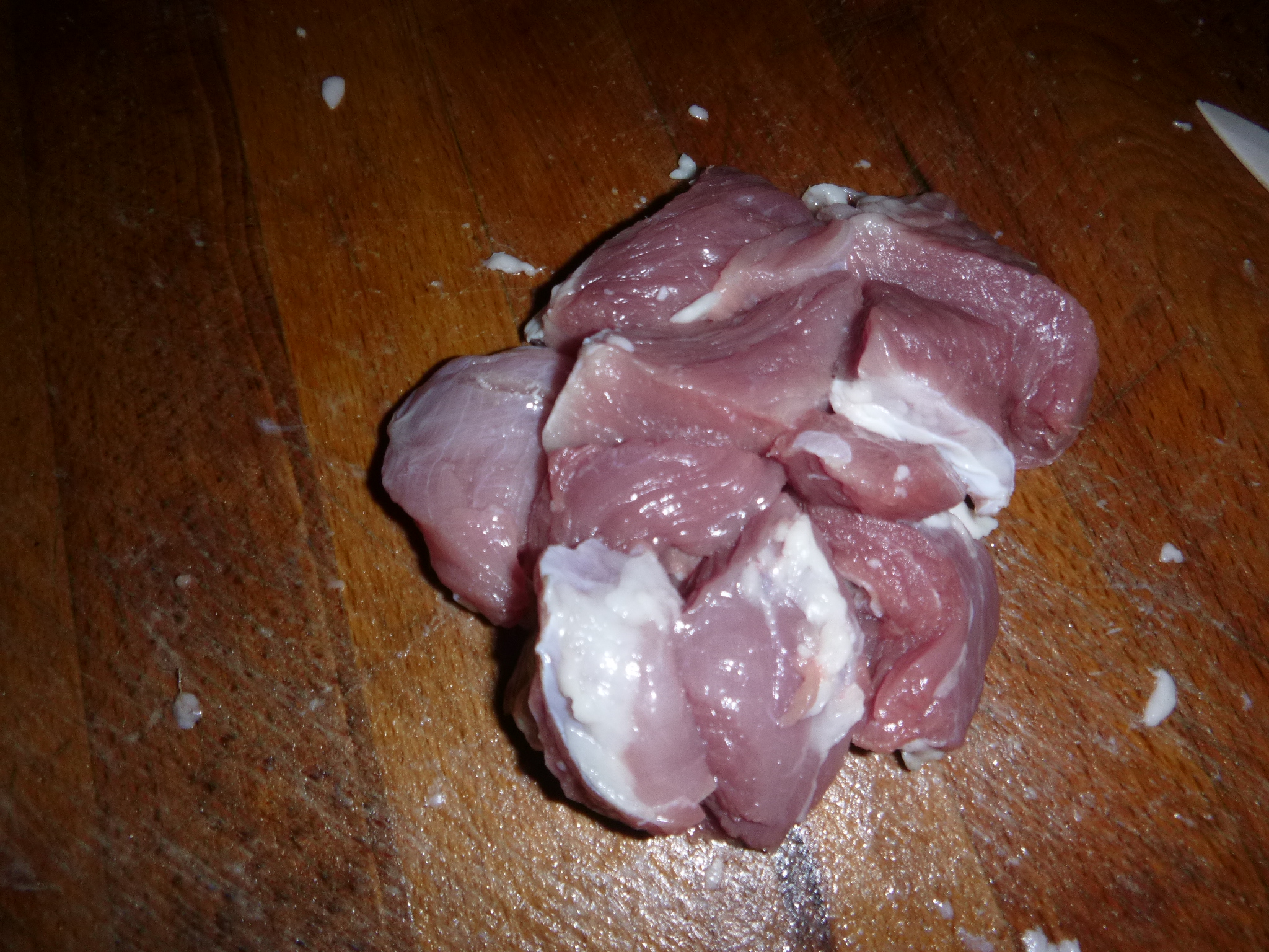 Cleaned up and trimmed and cubed stew meat, most of the stewed meat is being canned, either on its own or in a soups or stews. the rest of the pork has been cut into chops, roasts and so forth.