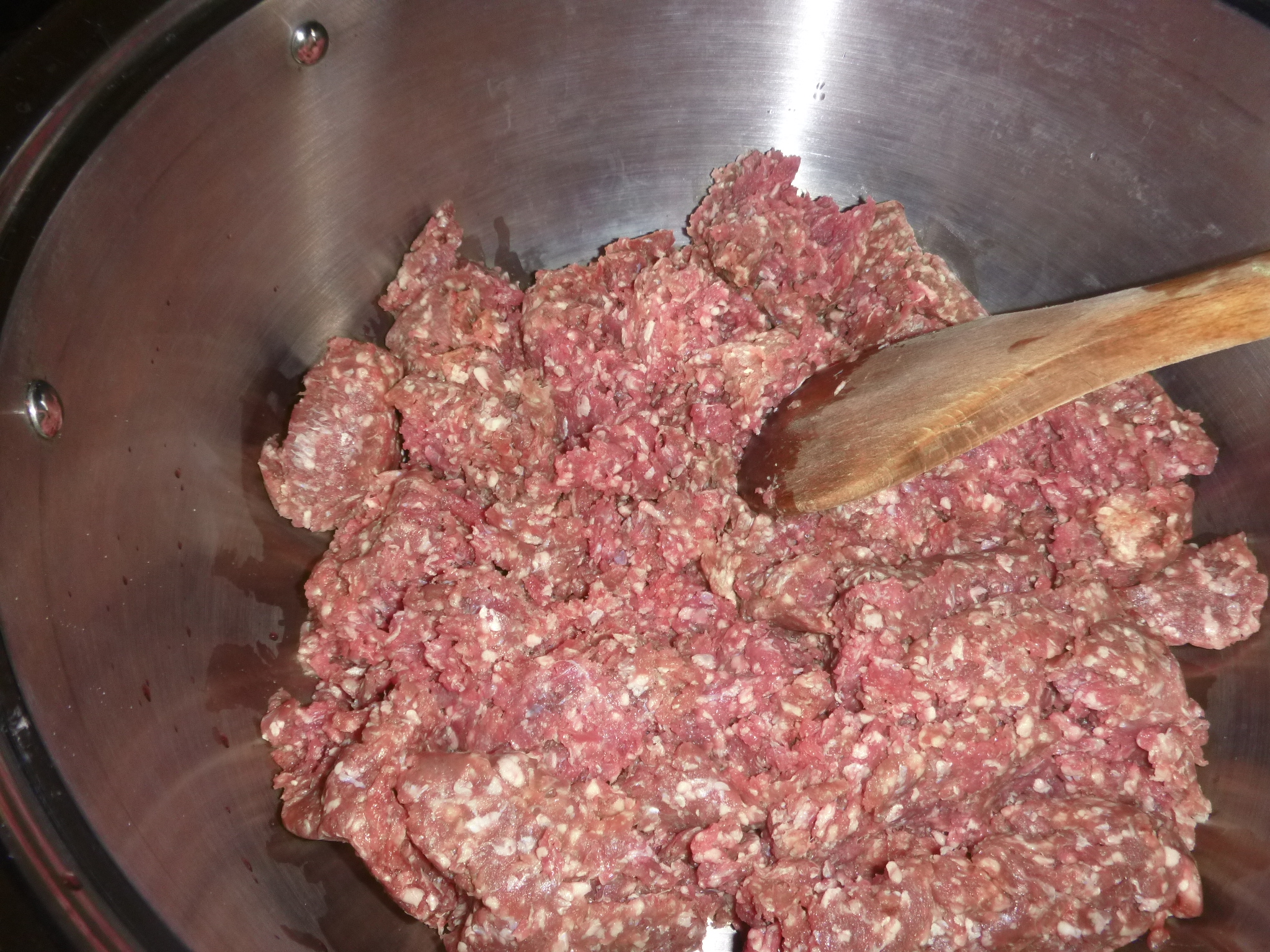 Cook together till meat is done and browned, then add 1 quart (or largest can) tomato juice or v8, 4 peppers of different colors, 1 quart of diced tomatoes, 1 quart tomato sauce, one can tomato paste, 2 large cans mixed beans and two cans of baked beans, 1 cup to two of chill powdered, and 2 large tablespoons fancy molasses, stir, simmer on low till flavours meld..