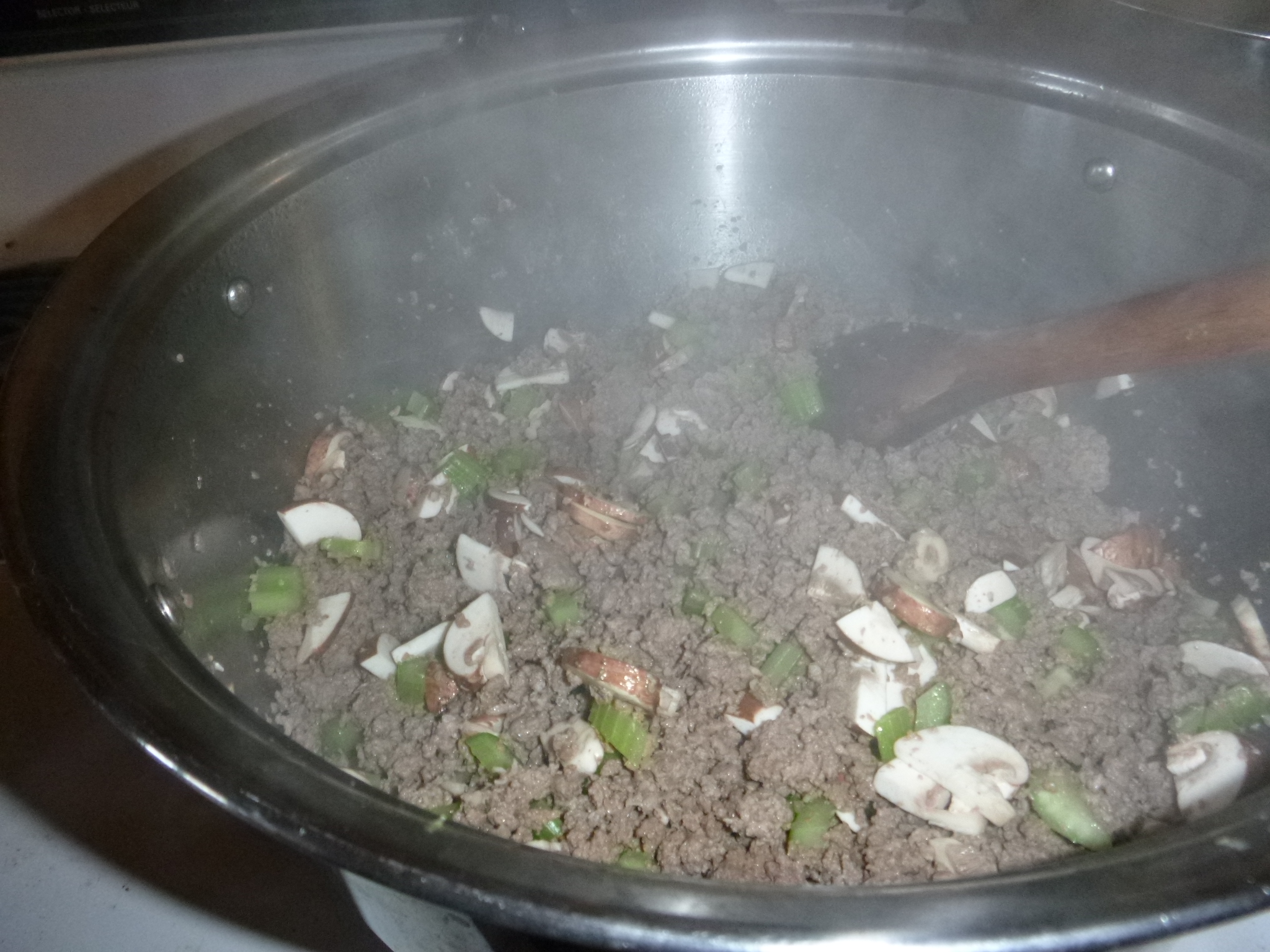 Three pound of beef, 4 diced onions, six cloves of garlic, six big stalks of celery, one box of diced mushrooms