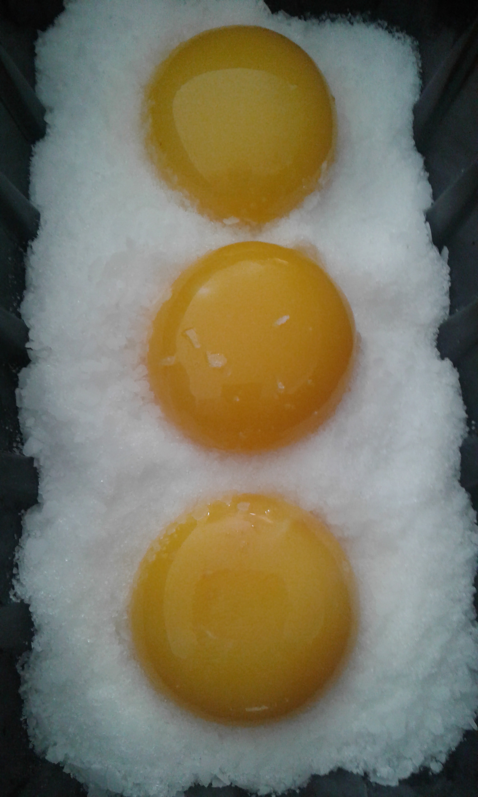 One cup of canning salt, one cup of sugar with the ratio of 50/50 for whatever amount you need for the amount of egg yolks you are doing, I did chicken because that is what is laying right now on the farm but we are going to do this again with duck an goose later this year as well. this is the bottom layer with the yolks on top, it was fully covered till you can see nothing and into my cold room, others use the fridge. at the  24 hour mark, I moved a touch more of the cure from the side over the egg on the top as it had melted a touch