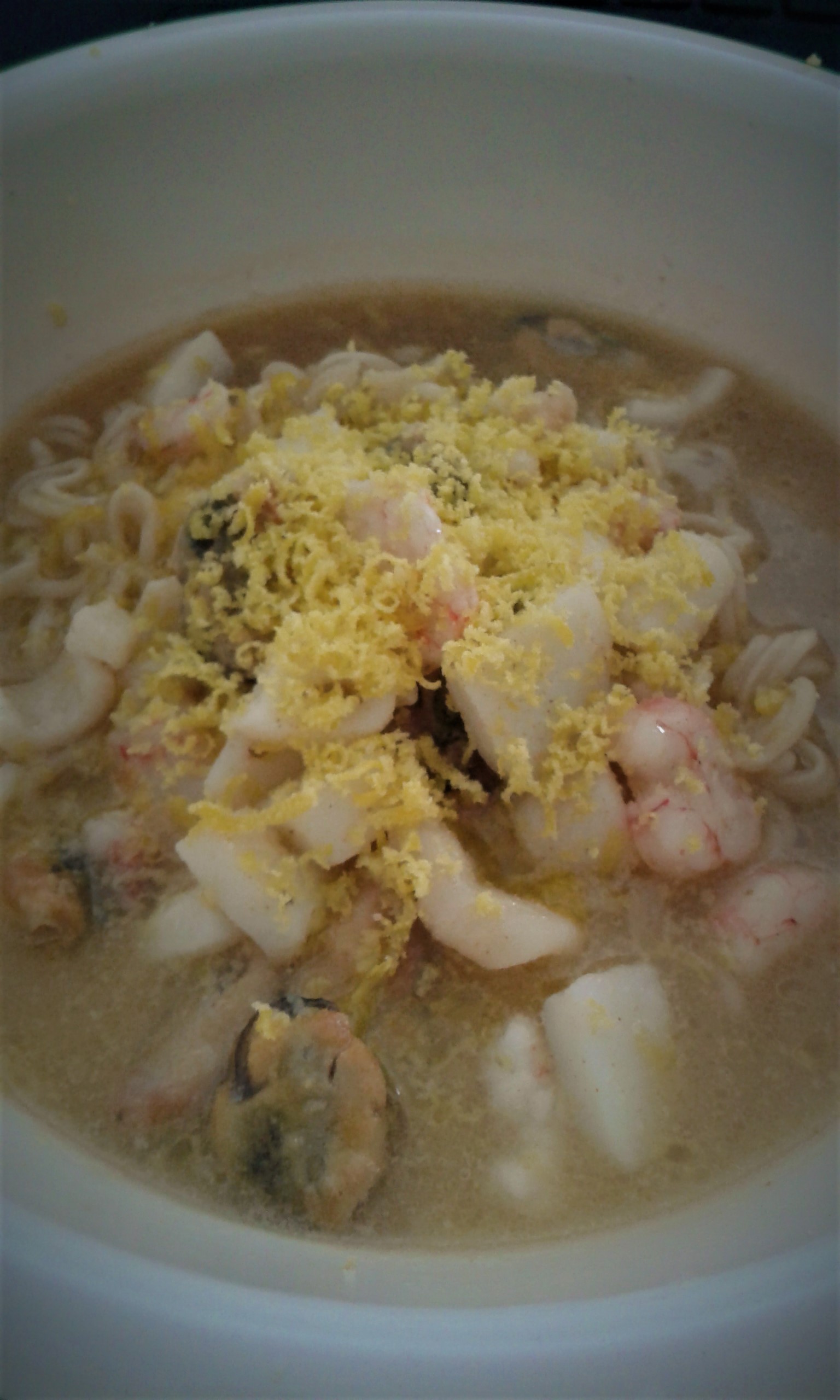 I poured the flavoured noodles into the bowl, then the seafood and butter-juices over top.. if it had been the right time of the year, I would do fresh green onion tops or chives but instead I grated some Dried Salted Egg yolk over top it.