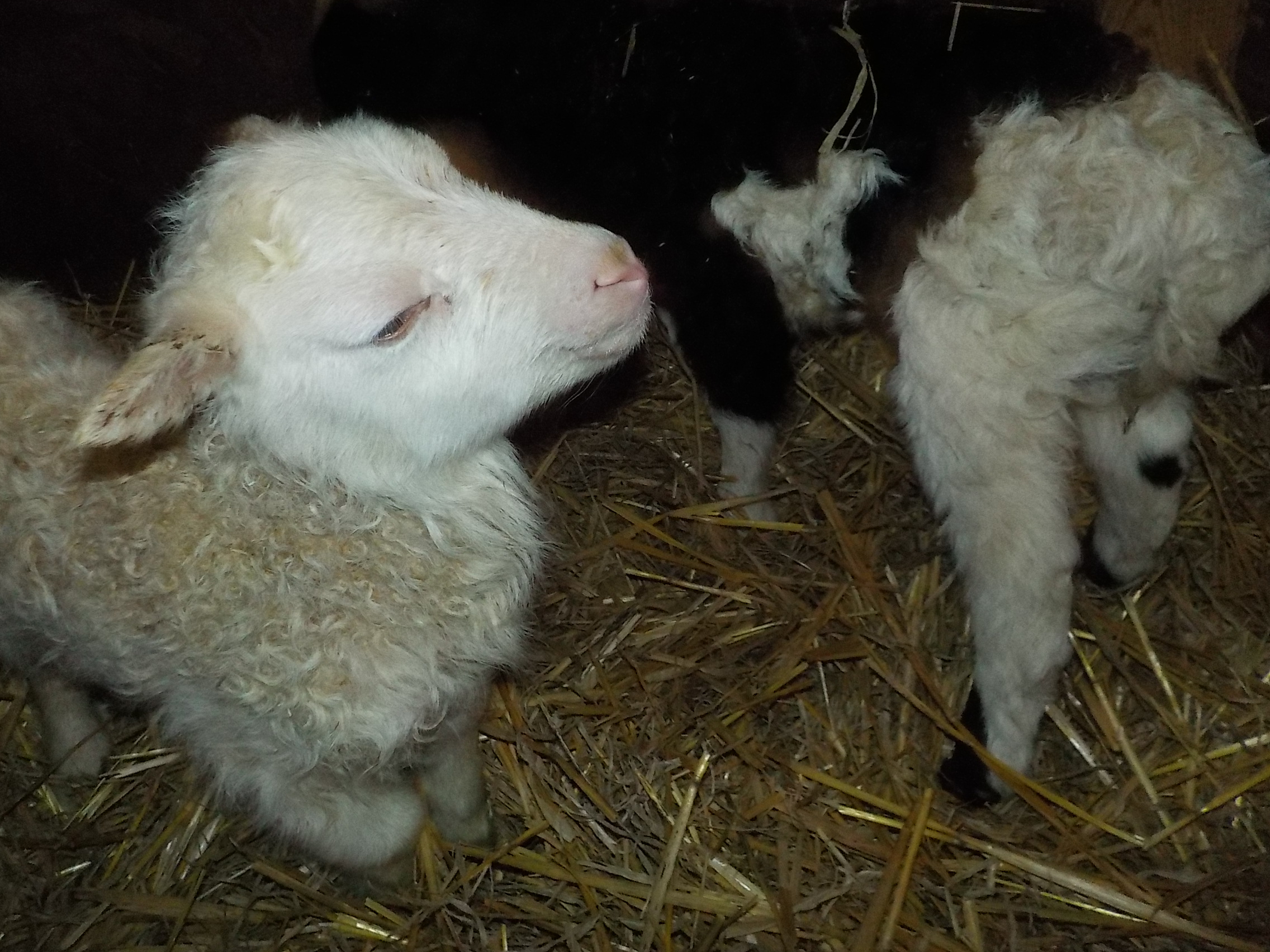 The little white boy has a lot of wool type coat on him and the little Black and White boy has a more typical hair coat at birth.