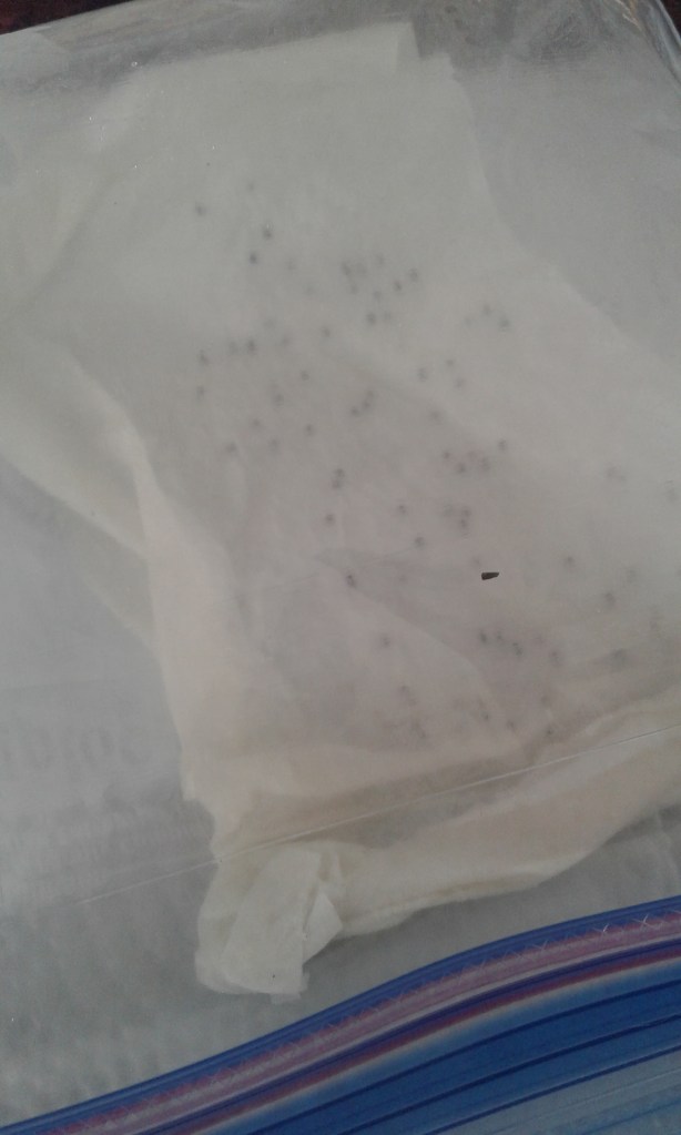 You will need paper towel (not tissue or bathroom, they are to fine and will rip far to easy for this process, but tissue is just fine for homemade seed tape.. we will get to that one. A plastic baggy and seeds. In this case we are starting Brussel sprouts..