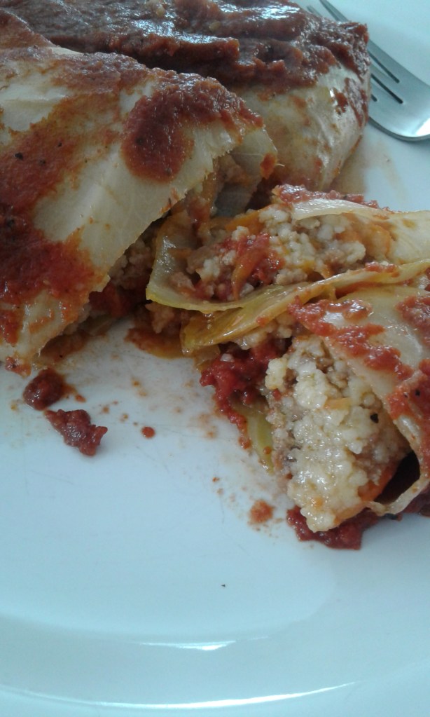 8 Large Cabbage Leaves whole and par-boiled to help soften them, when they turn that lovely softer green color.. you know they are ready to go.. handle with care as they are hot when they come out of their water, allow to cool just a touch before using them.