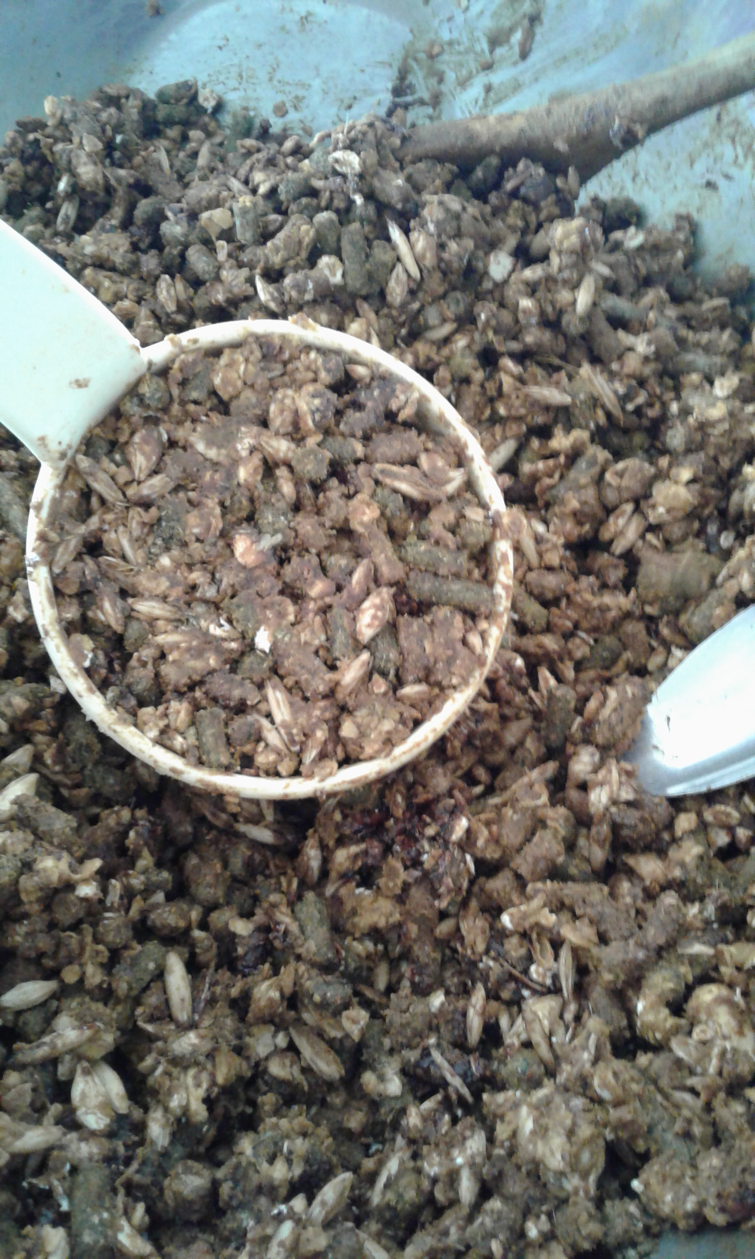 • you want to mix your Molasses into the dry feed blend first, then add all your herbs and mix it though, then drizzle your water over top, just a bit at first and mix it though. let it sit a min or two to soak in and then try packing it into your measuring cup for portions, if it won’t pack tight, its to dry.. it should NOT be wet.. just moist enough to stick together well.