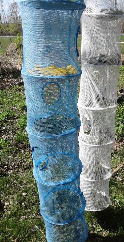 Now about my hangers, yes, they are the netted ones they sell for tidying up a room, they collapse to be flat, they have a heavy-duty clasp on the top that goes over my cloths line or a branch, they swing and sway in the breeze and their biggest downfall is getting everything into and out of those little holes on the front. You can stuff them fuller if you want to do but remember that once’s the leaves wilt that you want a full layer but not multi layers, you need air flow.