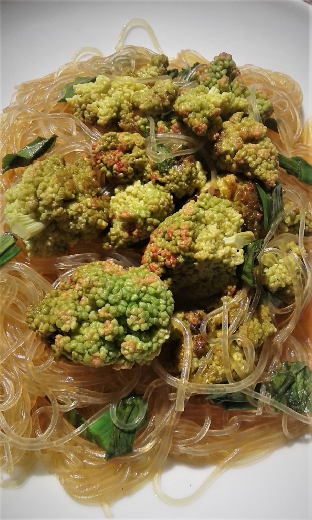 I processed the flower into the flower buds only and I decided on noodles with fresh green onions from the garden to go with freshly cooked noodles and a basic sweet and sour Sauce.