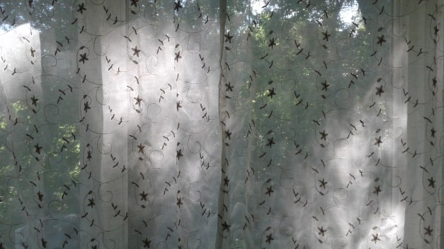We did get off the farm for a small trips.. one to the church basement wear I found these lovely huge and long curtains that fit my massive living room windows for a dollar each, I have a heavy thick-set for winter, but now I have a light summer set and it so matches my wall color 🙂