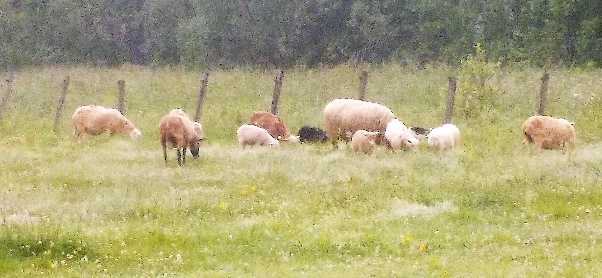 We had one good day of rain on weds which everyone loved, gardens, pastures and a refill off all the water barrels and so forth.. It was just misting at one point and I snapped a long distance photo of the flock grazing and when the auto program tried to clean it up, I got the below photo.. I love it, it looks like a painting to me..