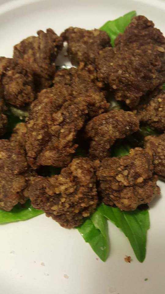 In a deep bottomed high sided pot or deep fryer, pre-heat your oil at med-high, your pot must be large enough so the meat is not really touching each other to much and that its all going to go in a single layer, otherwise the temp will drop to much on the fat and it will not turn out as well as it could.