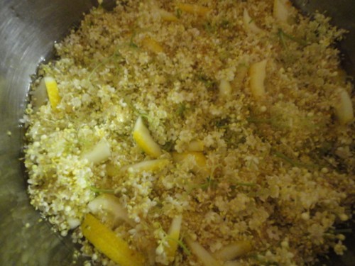 Pick the heavenly scented star shaped mini flowers off the stems over a bowl to catch them, you hold the stem and gently stripe them off with your clean hands. Put your flowers and one finely sliced lemon into a steel pot, just cover with water and bring to a simmer for ten min. Put into a cheese Cloth and allow to drain for at least four hours or overnight in the fridge.