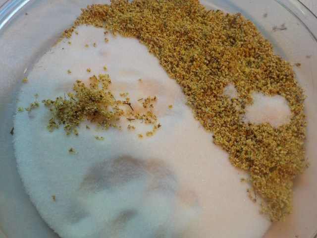 It takes a bit bowl of fresh Elderflowers to hit that pound mark 🙂 I dried 3 pounds worth of them, I still have lots of elderflower jelly and elderflower syrup in the pantry, so this year I focused on drying them for winter use. I decided to take a cup of them and mix them with a cup of sugar, mix together and put into a jar for a couple days to infuse, then I am going to blend them together and use the infused sugar in a cake, along with fresh elderflowers both in the cake and on the icing (coming soon)