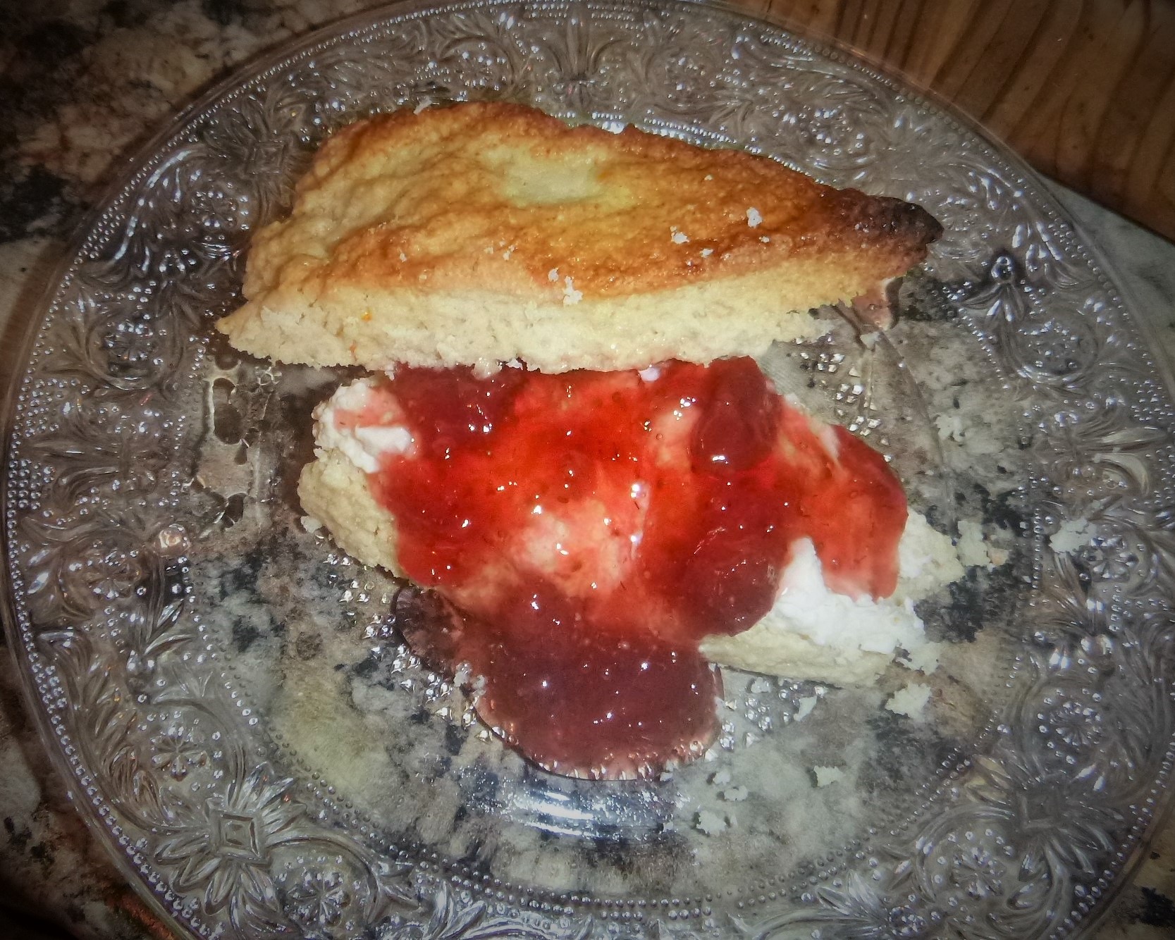 2. D > My Mum used to make strawberry and rhubarb jam – delicious … but I wonder if you had to add pectin in any form to get a reasonable set? Problem is for us that we can’t get strawberries to grow reliabily in quantity – so we eat as they ripen, usually just as they are, possibly in a bowl with a little cream. Your scone looks so yummy!