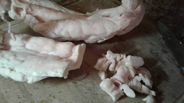 So this post is showing just one bag, all the bags are right around the same weight. I had really hoped that it would come in ground, which is the easiest way to get the fat for grinding back from the butcher but instead it was in slabs. I had to make a choice, grind it or cube it.. I when with cube it.. it means cracklings at the as well as lard.