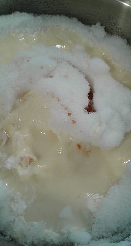 Fill your big bowl with your fresh snow, Take the top two inches off the snow if you can and then take fresh snow after that. Try not to take the first hour of your snow storm as it will have the most “dirty” snow of the storm.Ā  Then drizzle your Vanilla and your Sauce over the snow and mix it together with a big wooden spoon.. I always use a wooden spoon but I am sure other would work as well..