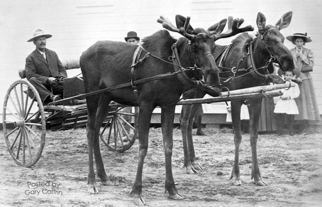 This moose team belonged to W.R. (Billy/Buffalo Bill) Day. They were found by a Metis near Baptiste Lake in 1910 and were reared by bottle and broken to drive by Mr. Day at Athabasca Landing during the winter of 1910. Mr. Day and the moose team hauled mail and supplies to Wabasca, Edmonton, Pelican Mountains, Calling Lake, Athabasca, Colinton, Rochester, Tawatinaw, Clyde, Legal, Carbondale and St. Albert. Buffalo Bill and his wife also ran a store at Calling Lake.
