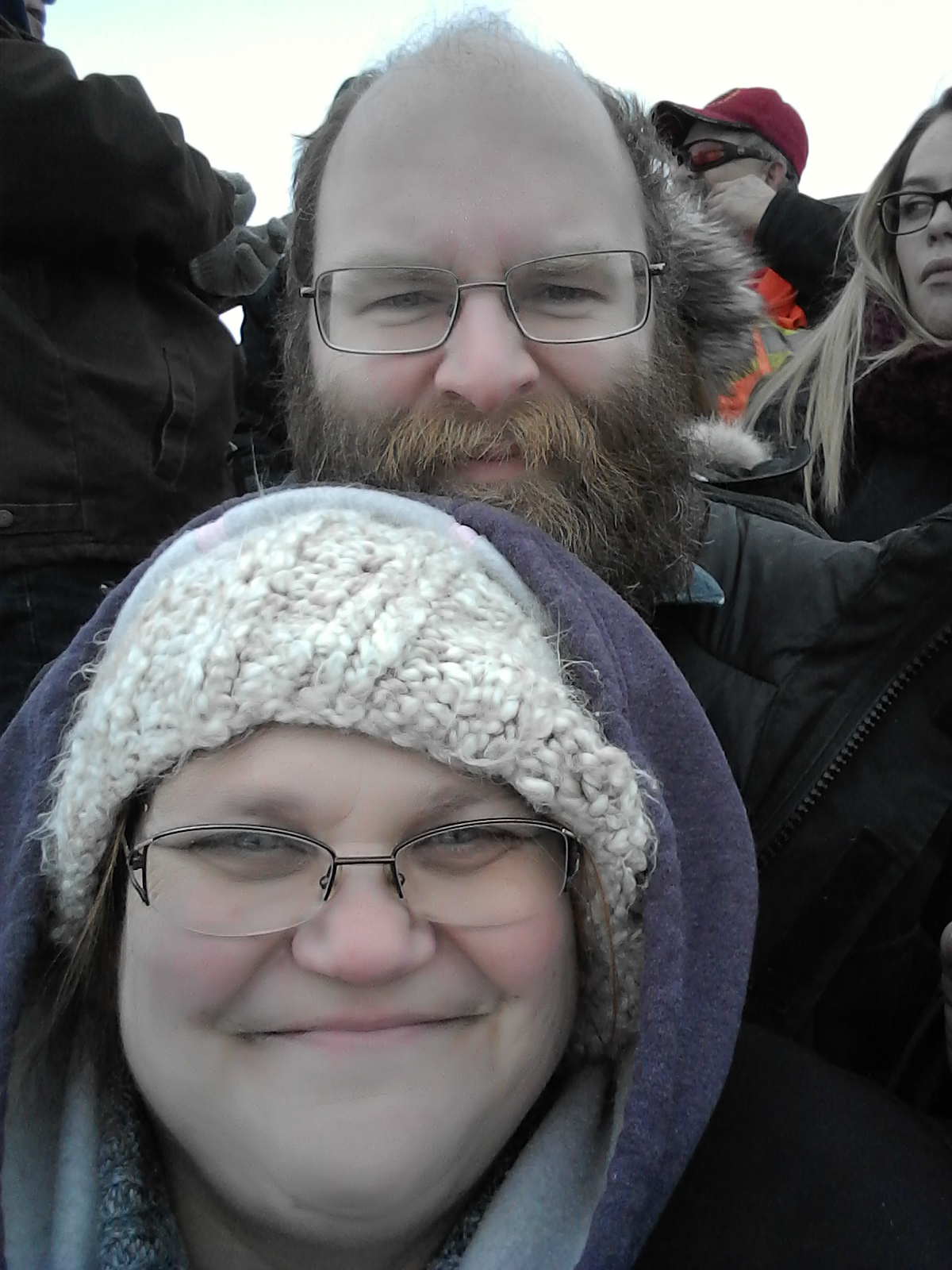 What was to be a mild day with light wind and sun, turned out to be 90 percent cloudy day, some light snow, a kicking wind.. A cold wind.. a bite you though four layers, pants, hot socks in winter boots, wrapped in a sleeping back kind of wind..  we even had a tarp that one of our group brought that was tied to the metal stands, I do not even want to think how bitter it would have been without it help cut the wind on our back but not our legs as that can under the seats. It was cold enough that we saw our breaths.. Hubby was warm, he was wearing his Canadian Goose Down Jacket (he took the hood down for the photo above) and he wore his skidoo overalls under it and hot socks in his minus 30 boots..  I clearly should have cracked out the Canadian Goose coat as well instead of thinking my four layers of shirt, sweater, flannel fall coat and then regular winter jacket was going to cut it.. but you see I foolishly believe the weather man and wanted to be able to remove layers.. brrrr.. I needed more layers..