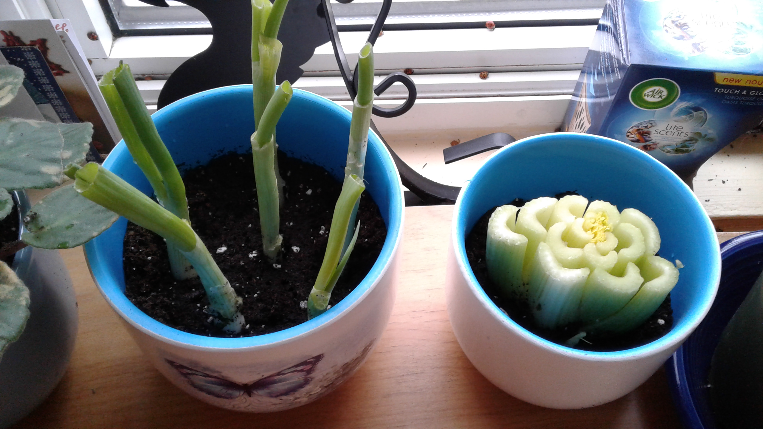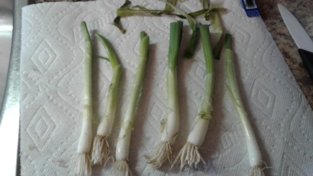 in my mom’s little space on the door that she puts her goodies , I found two smaller rolls of garlic sausage, one got frozen and one got used for supper last night, and tucked behind them was a wrapped up half used the greens main cut off fresh green onions, the outside of each had some slime-rotting leaves. That was easy enough to remove, far more important is the fact that these greens had strong active perfect looking roots.. So they got potted up and placed in a warm sunny window to start growing me more green tops.