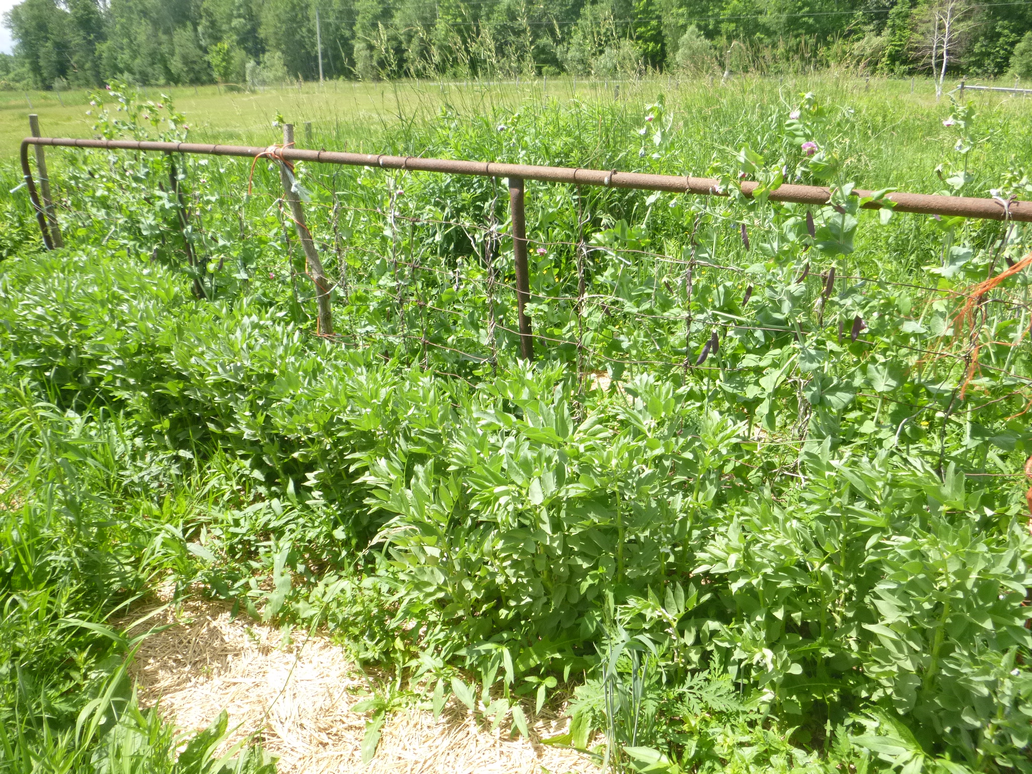 a) keep it as simple as possible, so that I can keep up on it as much as possible. Now what that means is that I might be doing things like doing a dig-flip line around some of my smaller gardens that are vertical. Normally we might do three feet or four around them, because they produce more, they are also a lot more work to do it that way as most of them need at least three season planting.. so I figure I will start with the planting row, and then do a dig-flip line that is easy to keep hoed and put a full season crop in the middle of the row and seed the rest with flowers. This bed is a great example.. two climbing crops per season, plus a full row of other crops in front of it, then heavily bedded down as the walk way