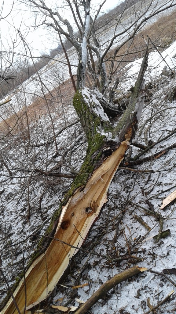 We got ICE!  It snapped power poles like they were toothpicks, it brought down tree’s and ripped roofs off and more.. We lost a number of tree’s in the pasture, part of the sheet metal on the big barns roof and a huge part of one of our big grandfather tree’s, that thankfully missed the deck and the old part of the house but if it had fallen different, it could have struck the house easily enough