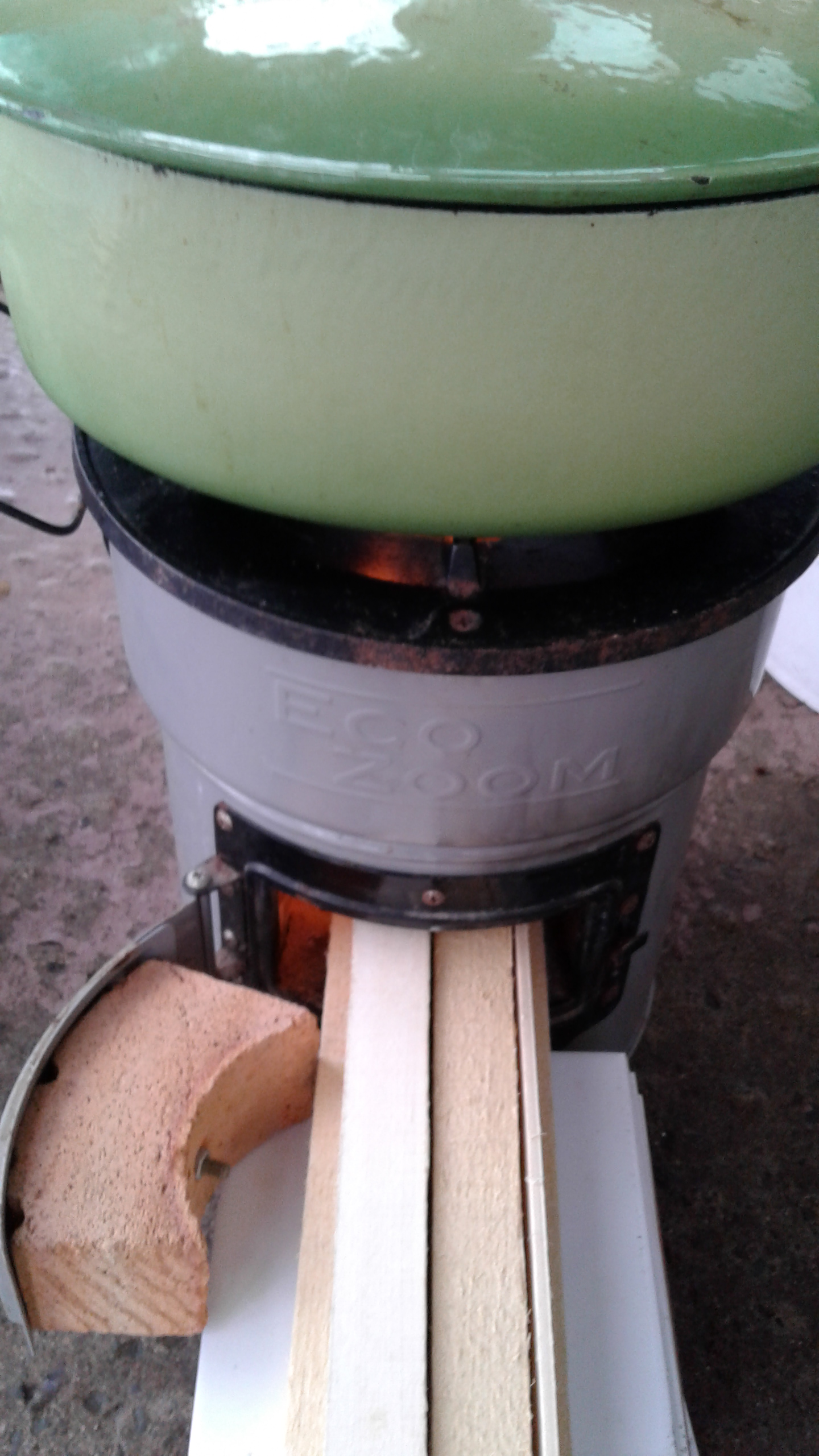 As always the Ecozoom stove is outstanding.. four little tiny sticks an you can boil a gallon of water, cook a meal and with the Shuttle Chef, you can hot water on demand, I really must get another one, so that I can keep hot water for drinks, washing etc in one and a meal ready in the other. You would be hard pressed to do even a faction of it with a regular fire with 1/4th of a standard wood stove piece of wood.  the kindle cracker comes in very handy for this as well. I used pre-cut and pre-dried pine for the stove during the icestorm. That is the joy of the properly done kettle stoves.. little fuel for big payout!