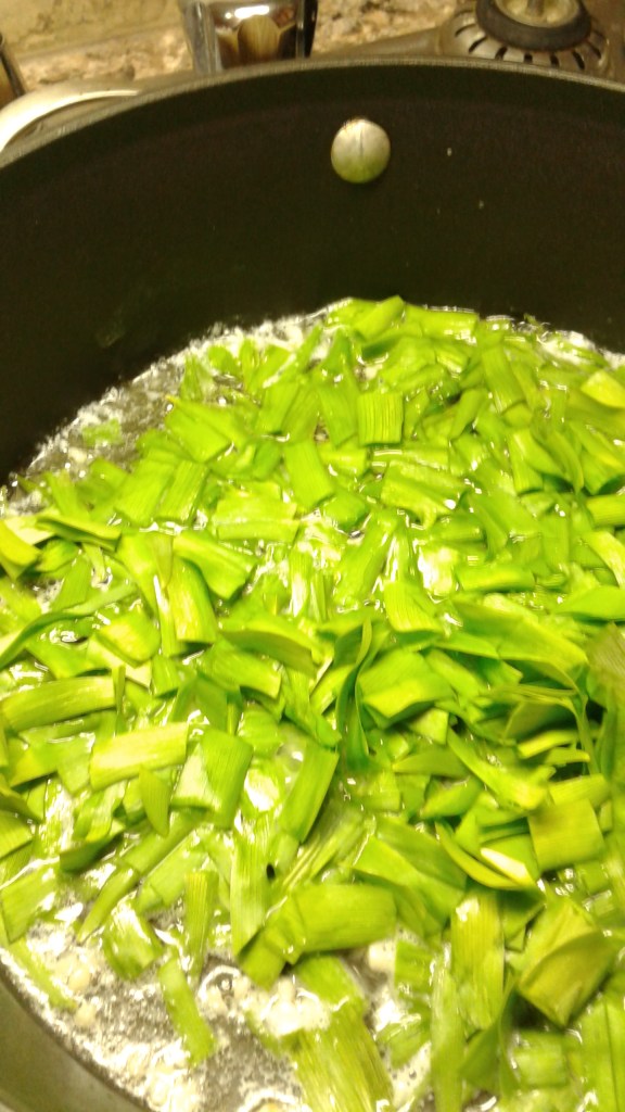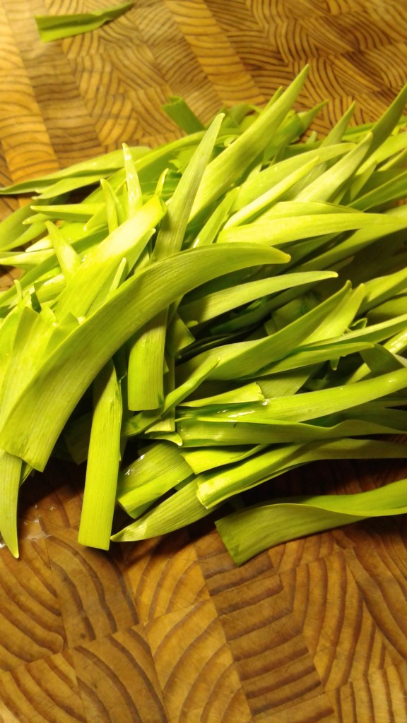 We headed off the farm and did a forage harvest of Daylily Leaves, I like to get them when the plants are between four to six inches high, I will harvest up to 8 inches high but not above that. I picked 2 cups chopped worth for the coming dish.