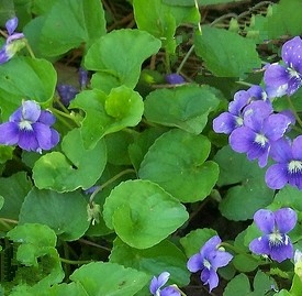 Leaves are heart shaped attached to long petioles, Five petaled purple or blue flower with white centers. Spread by short, branching rhizomes, typically in bloom from May to June in my %a garden zone.