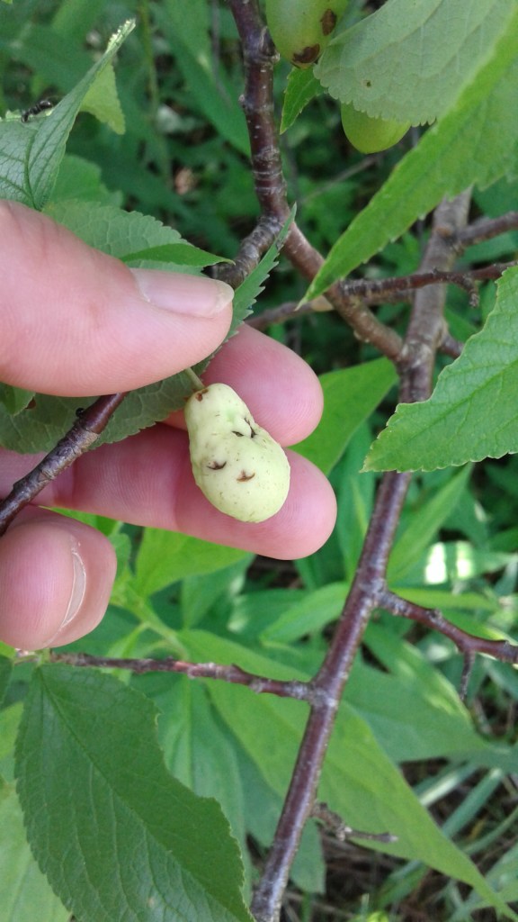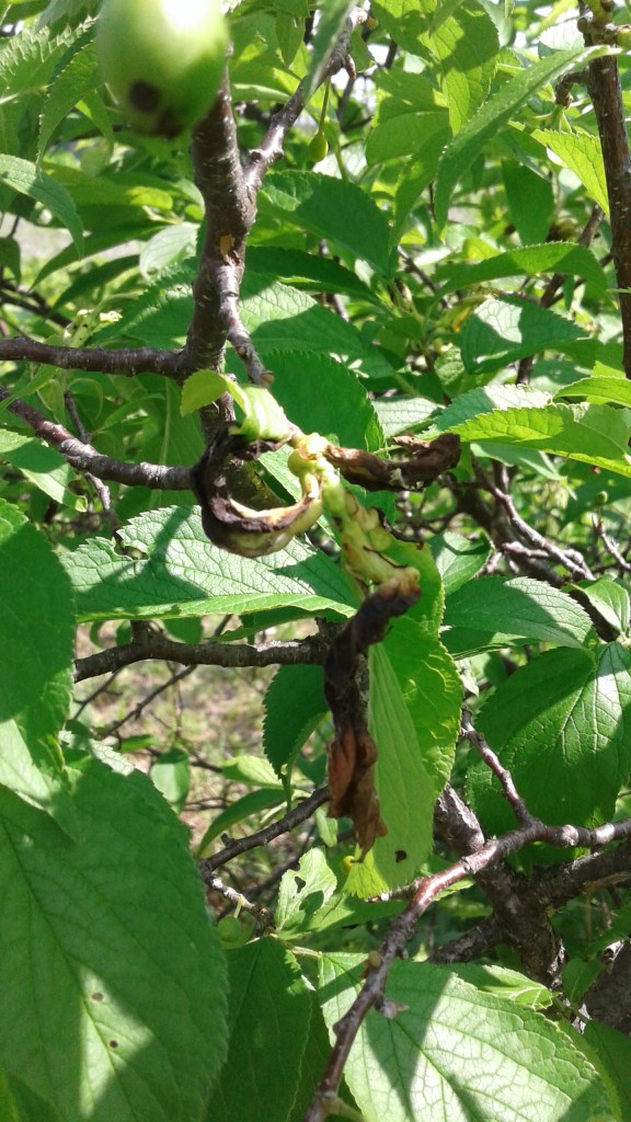 you can see the damage to the leaves and see that dark spot on the bottom of that plum.. that is the fungal infection showing itself and it will go in and cause the baby plum to grow in size and then if I let it (which I will not) it would get longer, go grey and puff out the spores to infect the tree again.