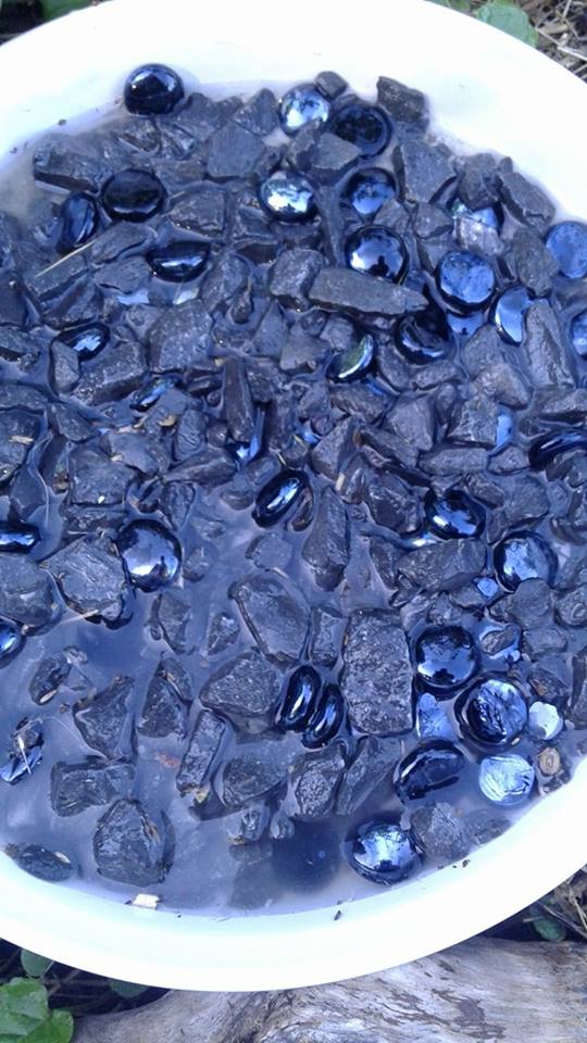 I picked up a plate from my second hand shop and at the same place I found some nice blue glass bits to mix into a base of blue-grey gravel. Its important to give them a nice mixed surface to land on and drink off.