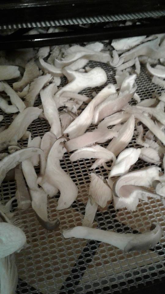 We stopped by the local mushroom growing plant and picked up four pounds of fresh Osyter  Mushrooms.  They were picked fresh while we waited behind the red line.. stunning mushrooms. While some will be eaten fresh cooked, most of them are being sliced and dried for future use.