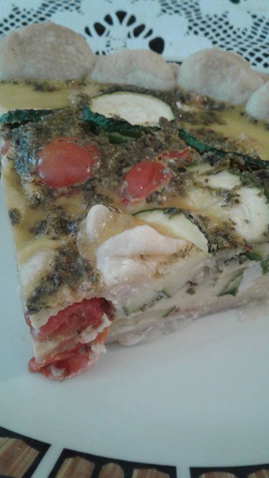 Then in a bowl, beat eight med to large eggs well, Then add in 2 tsp of dill, 2 tsp of Basil and 2 tsp of mixed veggie blend flavouring of your choice and 1/2 a tsp of salt.. Beat your herbs into the eggs well then pour over top your veggies in the pie shell. The zucchini will float up, it happens.