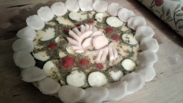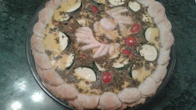 This is a very easy dish to make and its flexable. You will need one base sheet of pie dough for a regular sized pie plate. This can be homemade or it can be gotten at the store (Pie dough is really easy to make but not everyone does)