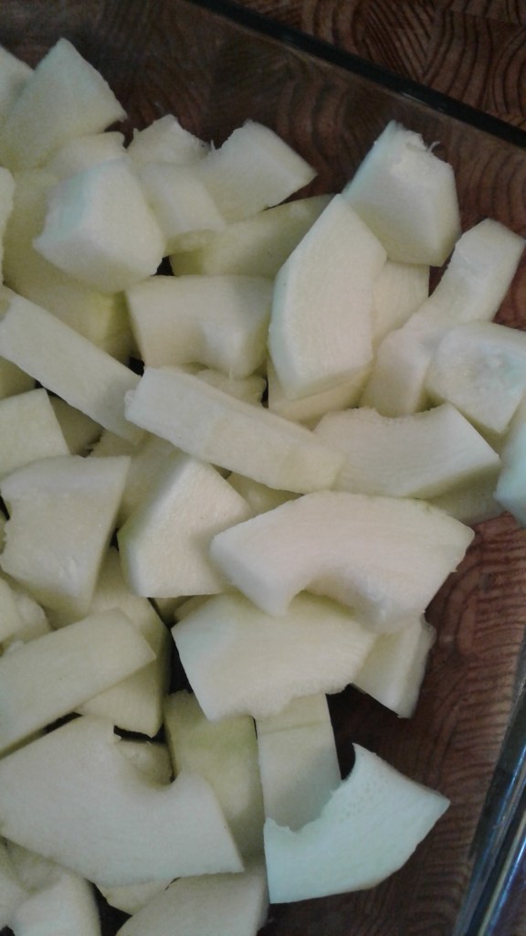 Take a large overgrown zucchini (but still green, no yellow on it yet) Peel it and take out the pith an seeds from the middle. Slice it into lines that have a curve to it and then slice that line into thinner slices that will look like the above. Do not cut them to thick or they can have trouble cooking all the way though. You want them just a touch thinner then you would for cooking apples as they will a touch firmer then a apple even when baked.