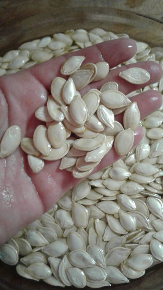 So with the above in mind, I selected the two pure pie pumpkins that were ready first to save seed from. I cleaned the basic seed out of the pumpkin. Then I filled the pan with water and let other bits float to the top, empty seed pods also float, remove them, if anything is stuck to the full seeds, help wash it off.