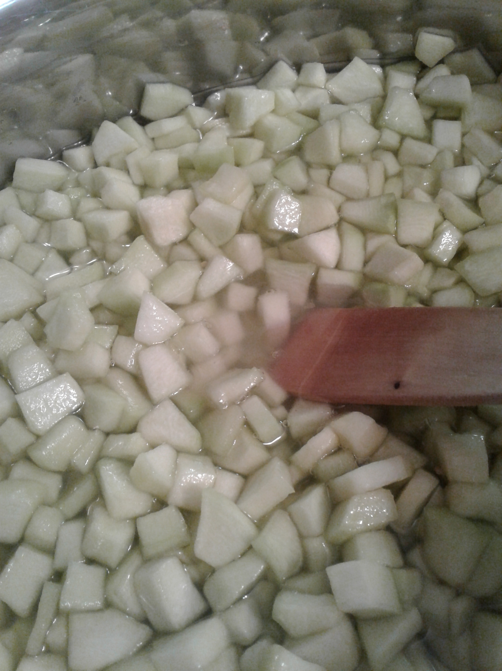 I love Zucchini canned fruit.. This is often called Mock Pineapple and I have talked about it before on the blog. I have done it a number of different ways, my grandmother made a version of it with lemon’s.