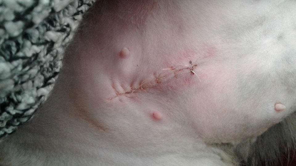 Her surgery area looks great post 24 hours after her spay and she is chowing down on food/having a drink. I know its a long time between the time we take it away and before they get home to eat but its the best for their system before and after they go under.