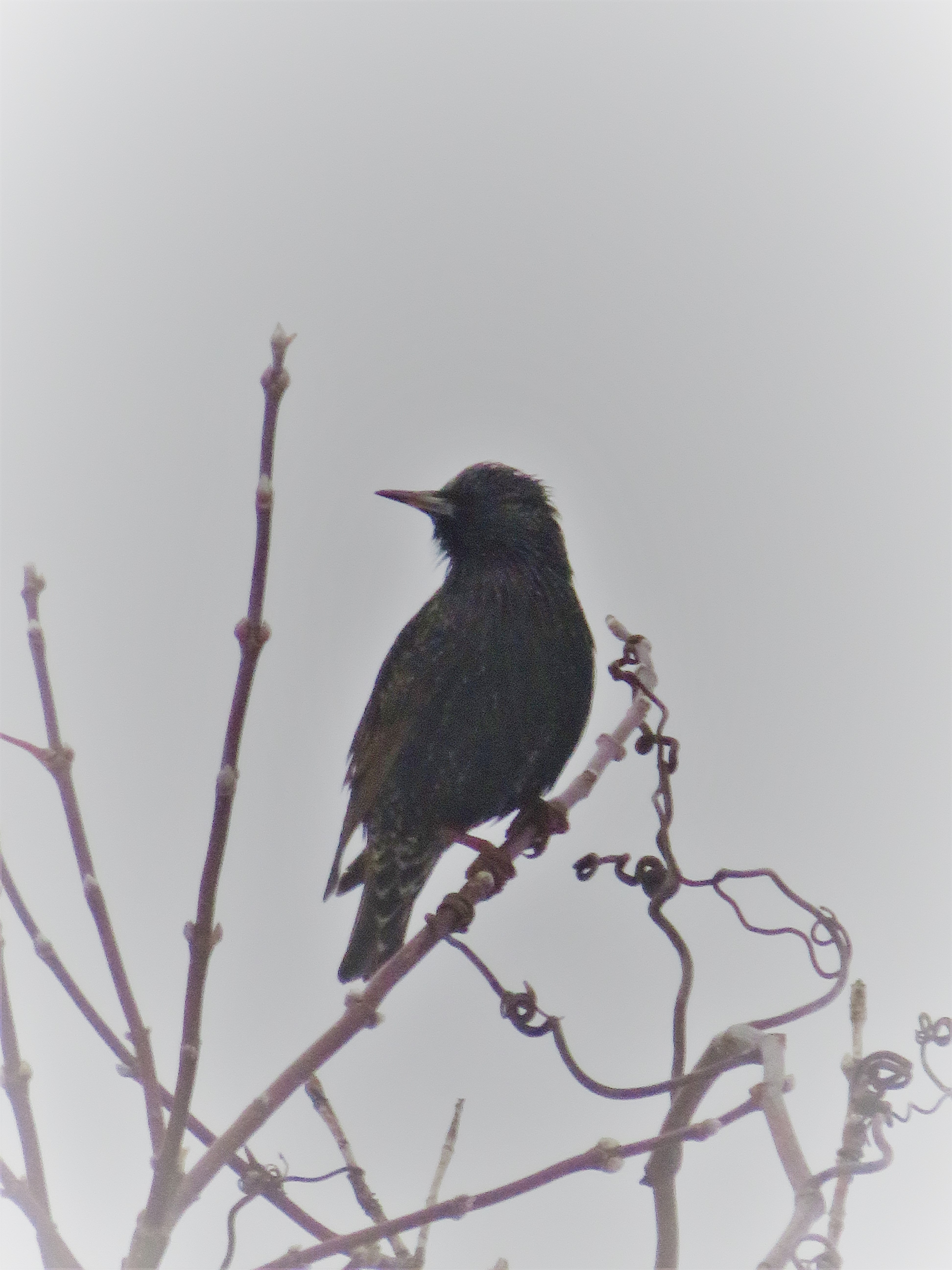 Hubby called me and said, there are dark birds way high up in the tree and I barely snapped a photo before they were gone.. this one is the best, I love the curling tips of my hop vine that grows up and around this big tree in my food forest..  The start of the misting was already there due to the time of day, I allowed it to stay as it worked with it..  I did clean it up but decided in the end that I liked the “frosting” that the shading gave more.