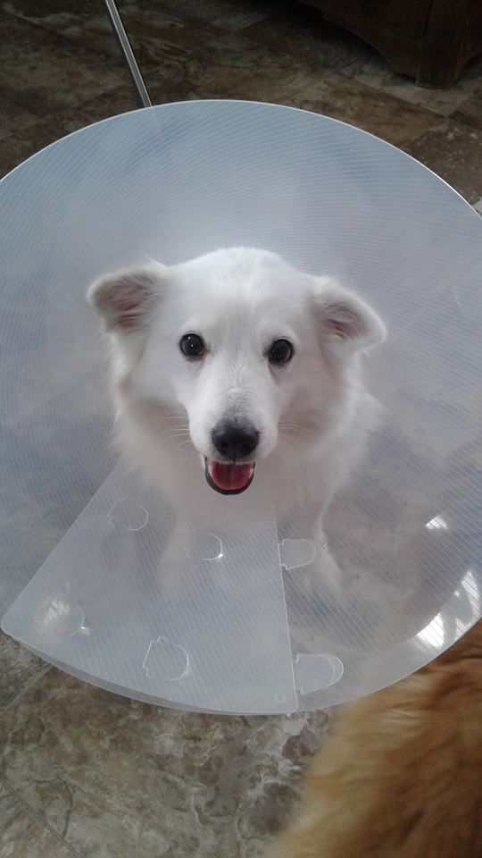 Good news, but oh dear, the ‘cone of shame’ 😀