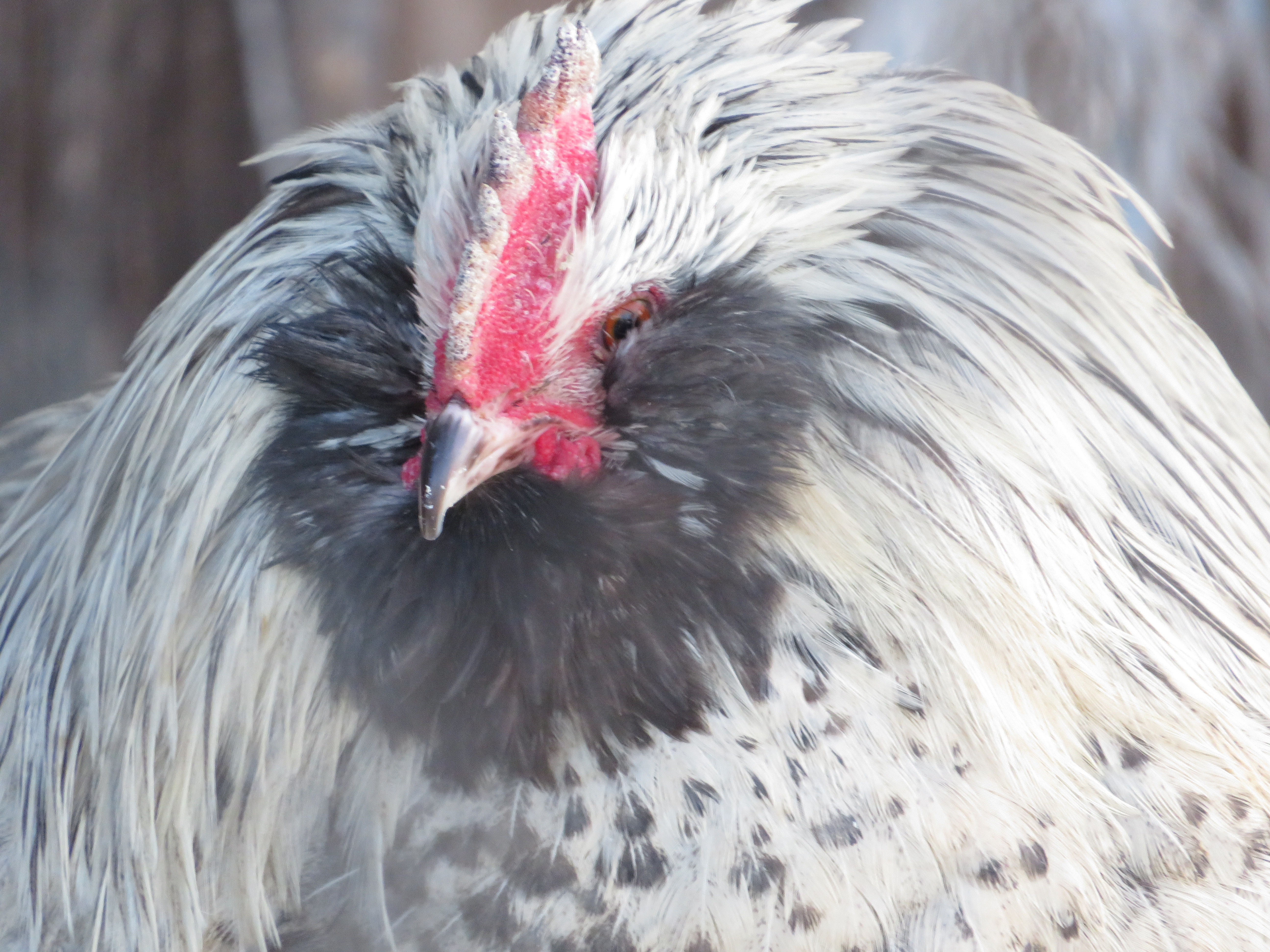 Silly Rooster.. sitting outside in the bitter cold but sun.. look at that frost bit nipped comb on him.. shakes head.. he will lose those tips and end up with a smooth comb. I am honestly surprised that he had a issue, he has such a small one. Its this winter.. I gave up letting them make the choice in these last two storms.. I normally trust the birds to know when its cold enough to go in.. but the last two big storms, we have moved them and locked them down.