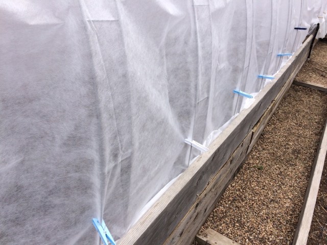 As for the wind trying to blow away our hoop tents and other season extenders, we use clothespins to hold the fabric on, and we secure the end hoops to the wood of the raised beds when needed. We also utilize long garden ground staples to help hold things down.