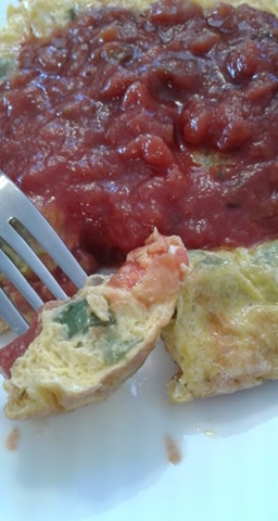 Then put your salsa into the hot pan and allow it to heat up till its warm and which takes maybe 30 to 45 seconds and then put your warmed salsa on your lovely omelet. Adjust your salt and pepper as needed for your own taste.