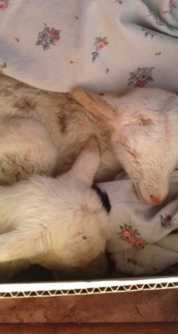 My mom asked to give name to these two, she asked them to be called Halo (for the biggest of the two and HoneyDew for the littlest) I can’t allow myself to get attached to the point of names yet plus they are both rams. So I will call them H1 and H2. They are now both on the bottle with powdered sheep milk replacer. They are still both alive 24 hours in.