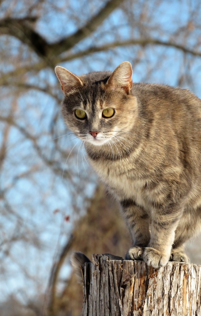 This was one bold little guy, smart enough to stay out of the range of the farm cats but close enough to keep them interested in seeing if they could get him. he was using the small branches to his advantages