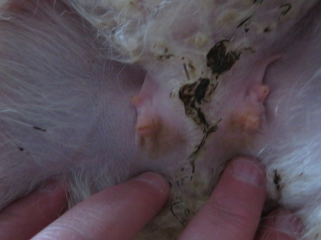Pardon the bit of manure on this little ewe but just so you can see what I am talking about.. Now the issue with these should be clear enough, a ewe only has two milking quarters and regardless of if these two little front teats are giving milk or not (many do not) if a lamb latches on, it will typically get 5 to 10 percent of the milk available and keep trying hard on it, where just behind that teat, is the good teat with lots of milk just sitting there waiting and not being properly used.