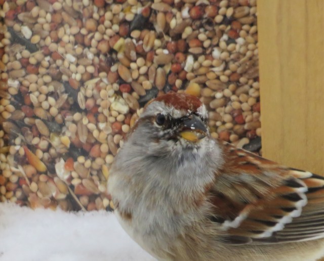They finally found the deck feeder, dance of joy!! new flocj of sparrows are coming every day now.. and then take turns between the deck feeder and the bigger tree feeder.