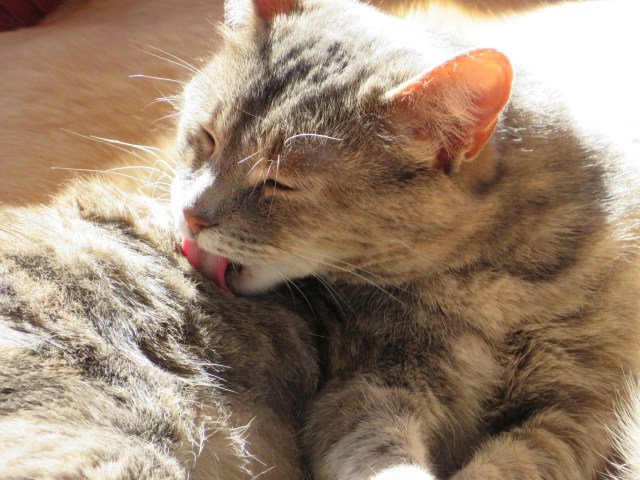 Sofie enjoying the warm sun and a relaxing grooming..