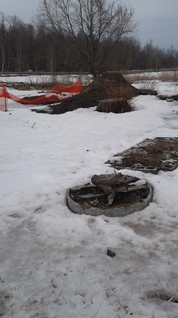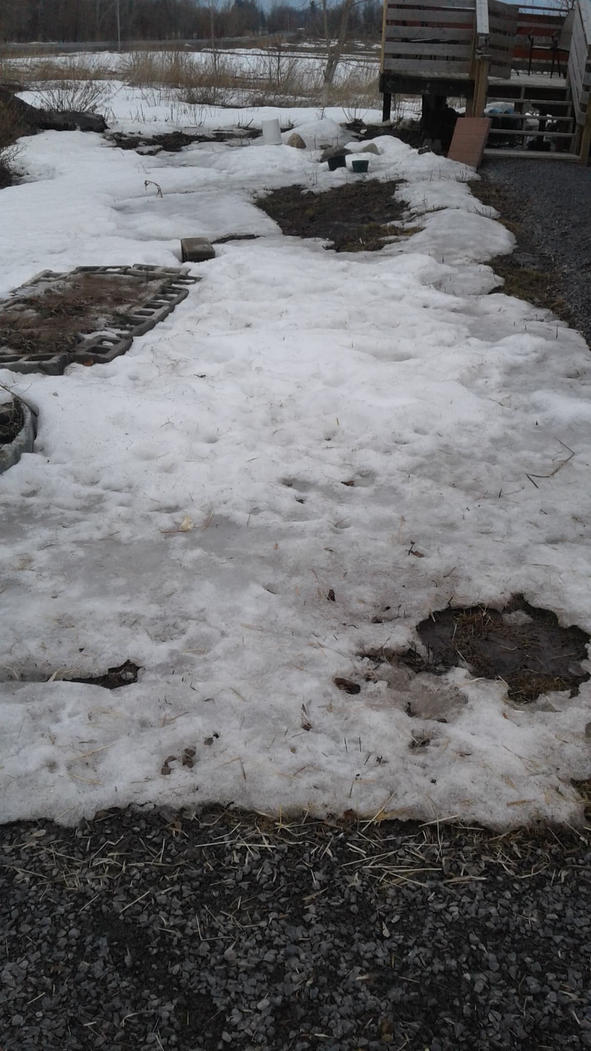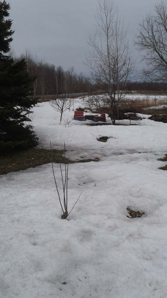 While its starting to thin out in places in the drifted area’s the snow is still knee deep, so I will take more detailed photos in there in may for you.. but there is the garden beds, the hedge rows and much more back there.. Right now.. lets to put it as its big, its got lots of things being planted in there and its still very much pretty much under snow cover yet.